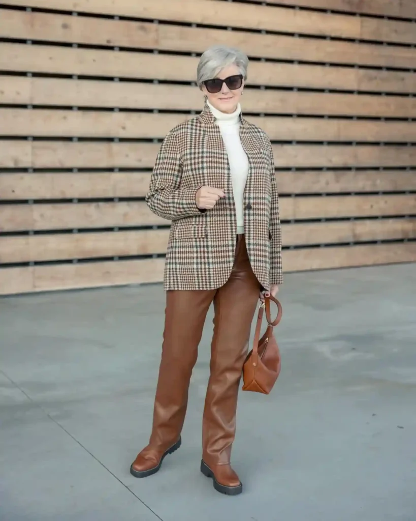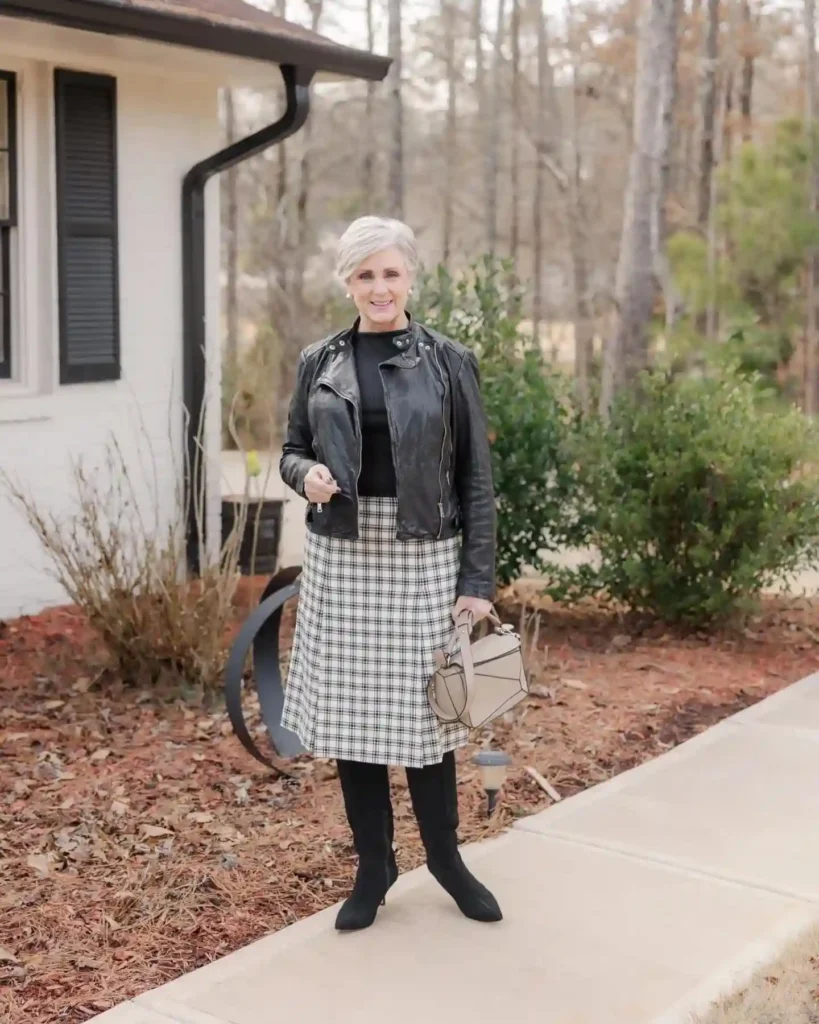 Who says travel in your 50s can’t have a bit of a rebellious streak? Combining a classic plaid midi skirt with a black leather biker jacket creates a stunning balance between “proper” and “edgy.”