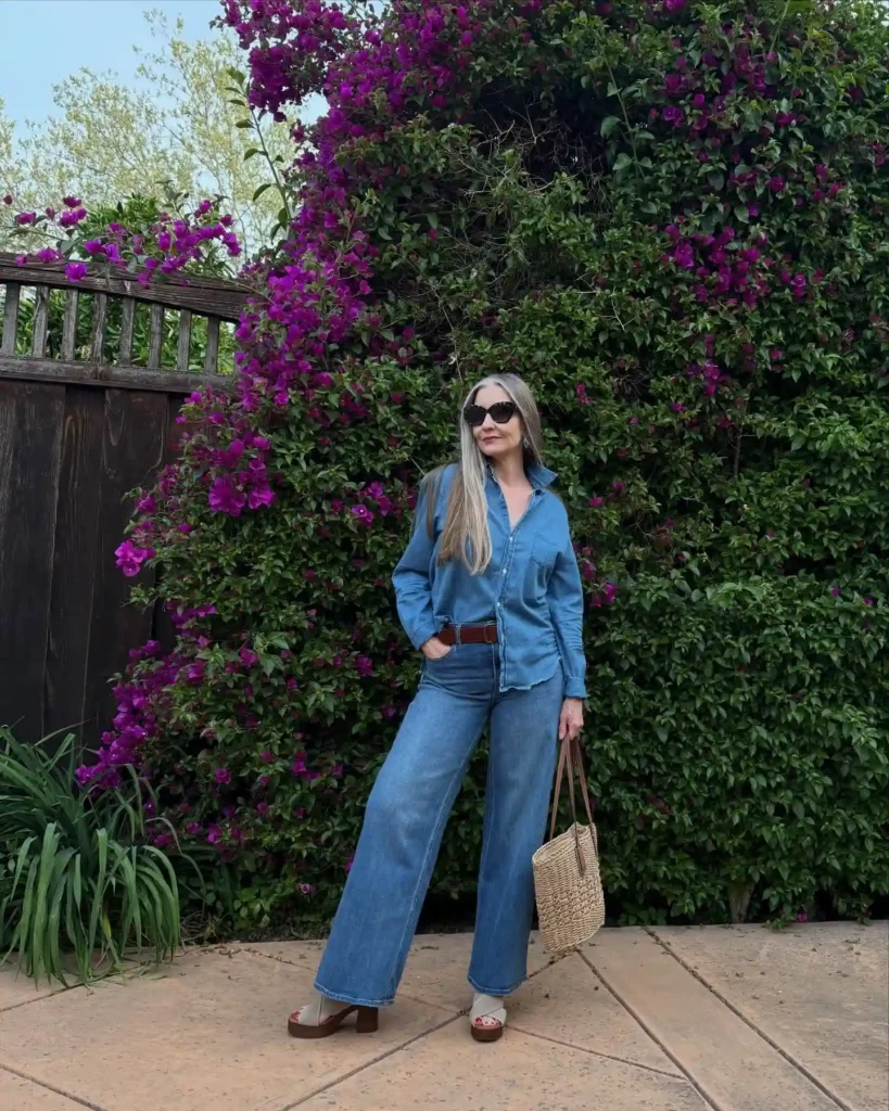 Wide-leg denim is having a major comeback, and it is incredibly flattering for women over 50 as it balances out the hips and creates a long, lean silhouette. This “double denim” look is effortless and perfect for a casual day of road-tripping.