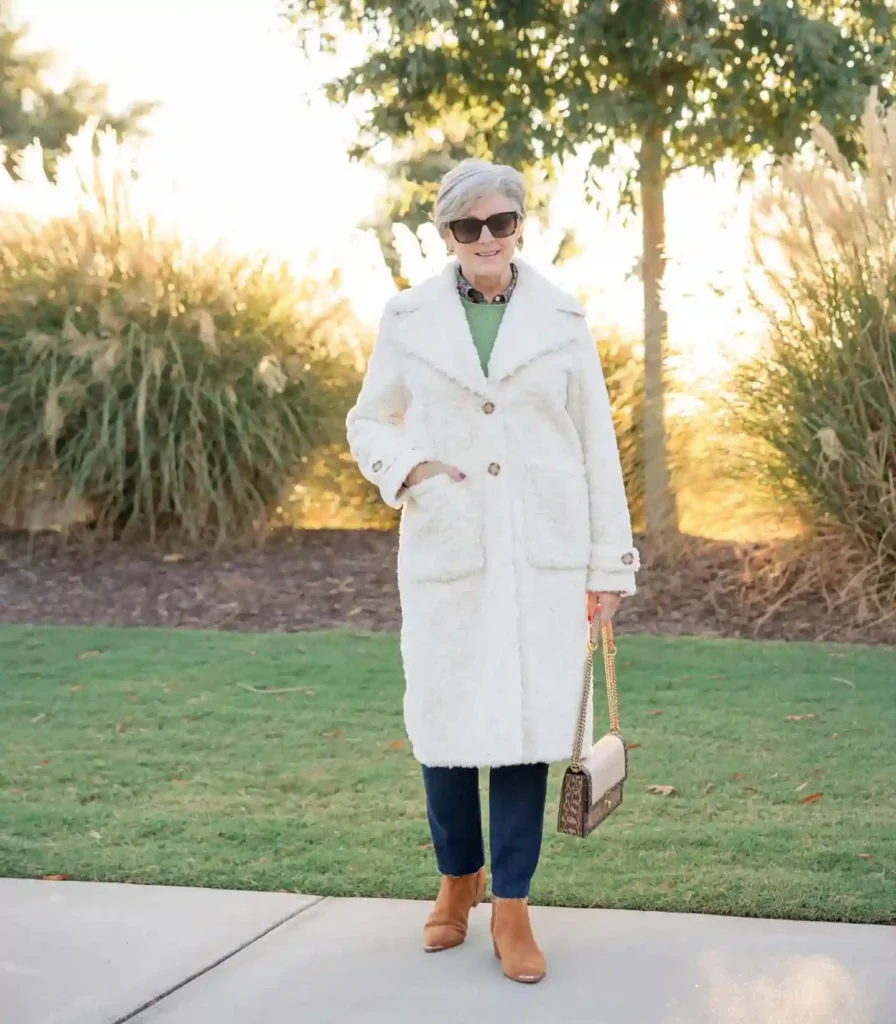 Layering a pop of color, like a sage green sweater, underneath the white coat adds a subtle “earthy” vibe that feels very current. This is the perfect look for a winter market tour or a cozy mountain getaway.
