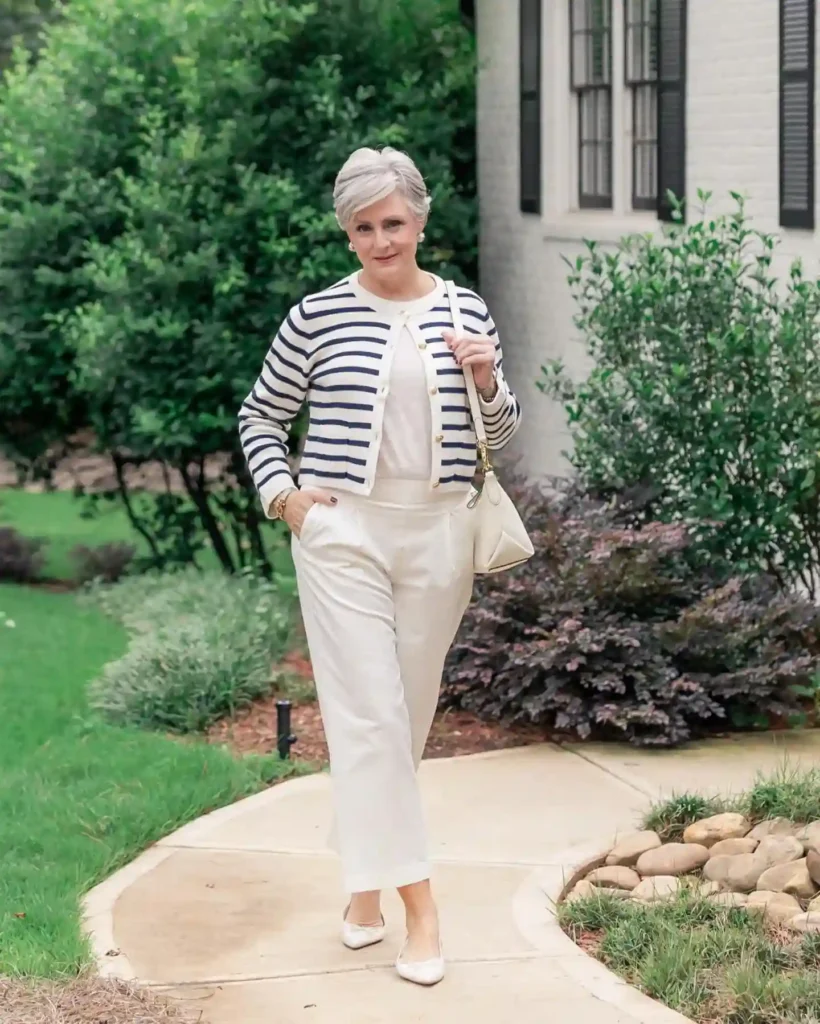 The striped cardigan draped over a white linen or cotton tee provides a nautical flair that is both functional and stylish. Keeping the lower half of the body in a solid, bright white keeps the look feeling light, airy, and expensive.