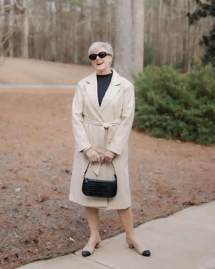 - The Bag: A neutral, architectural handbag in a taupe or beige shade prevents the outfit from feeling too dark or “heavy.”