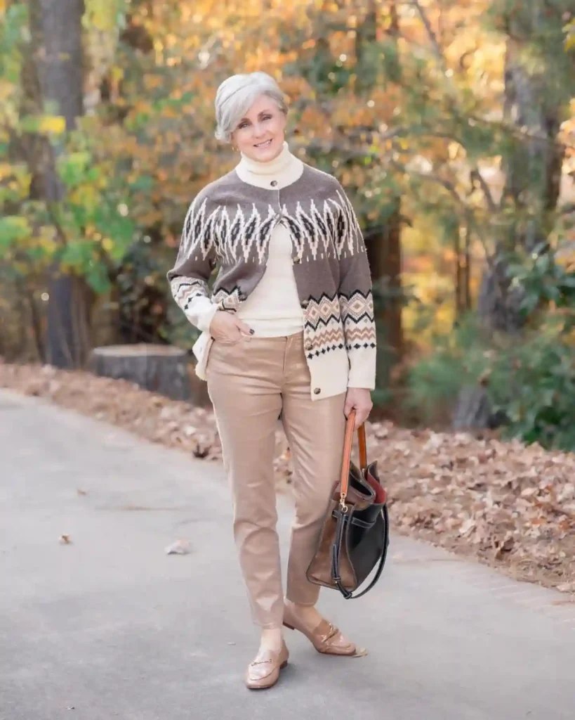 This ensemble is perfect for a scenic countryside tour or a relaxed day of travel by rail. The star is the Fair Isle or patterned cardigan, which brings a sense of cozy, artisanal charm to your look without the weight of a heavy coat.