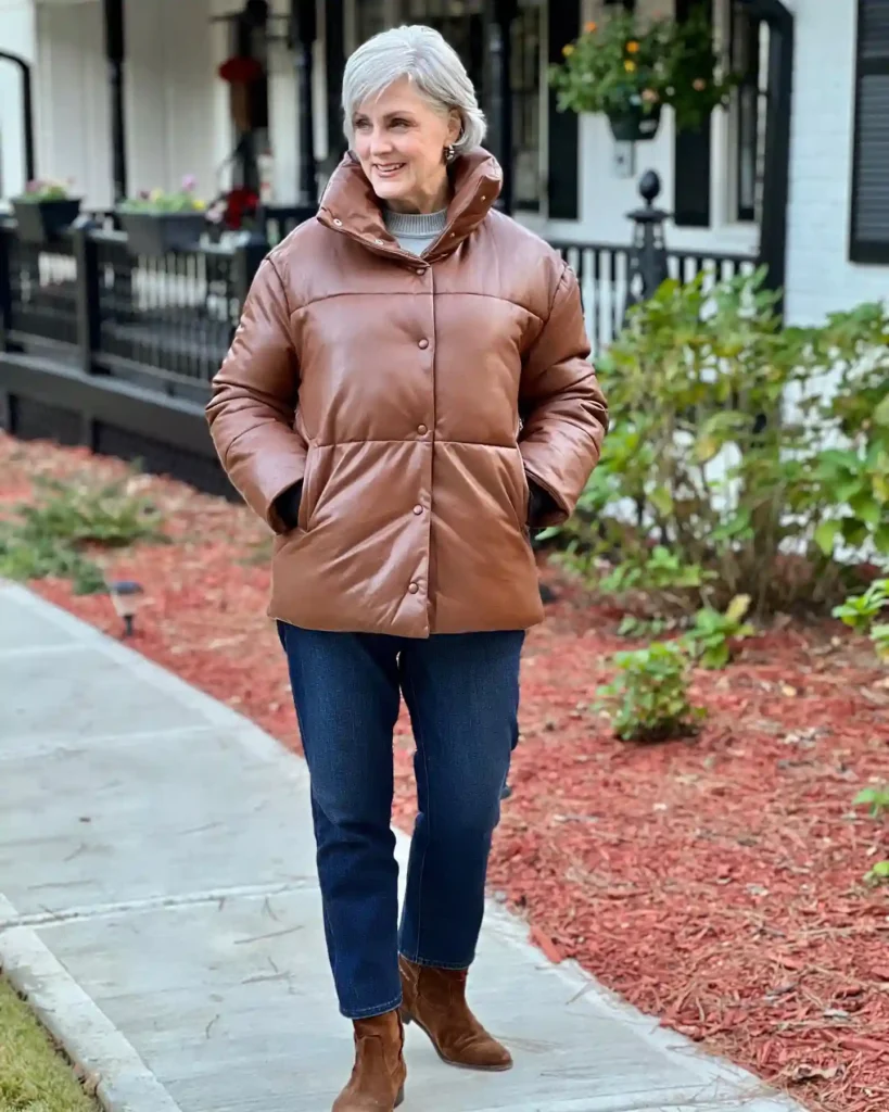 Pairing high-end textures with classic blue denim creates a “cool-girl” aesthetic that works at any age. It’s the ideal outfit for a city brunch or a casual gallery opening where you want to look fashion-forward but effortless.