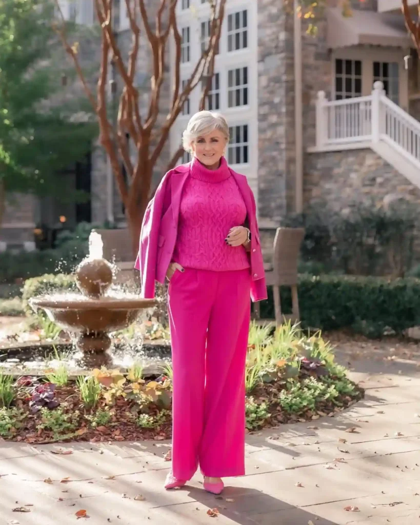 There is nothing quite as impactful as a head-to-toe monochromatic look in a bold, vibrant color like fuchsia. This outfit is for the woman who isn’t afraid to be seen and wants to bring high energy to her travel wardrobe.