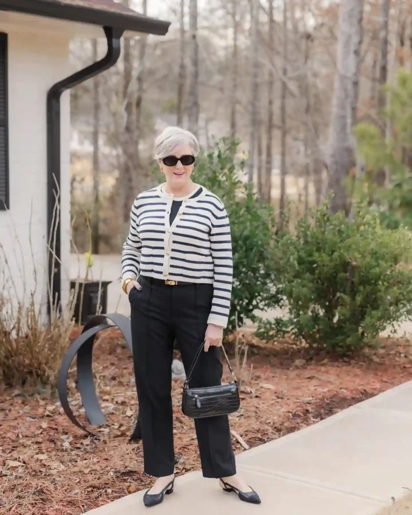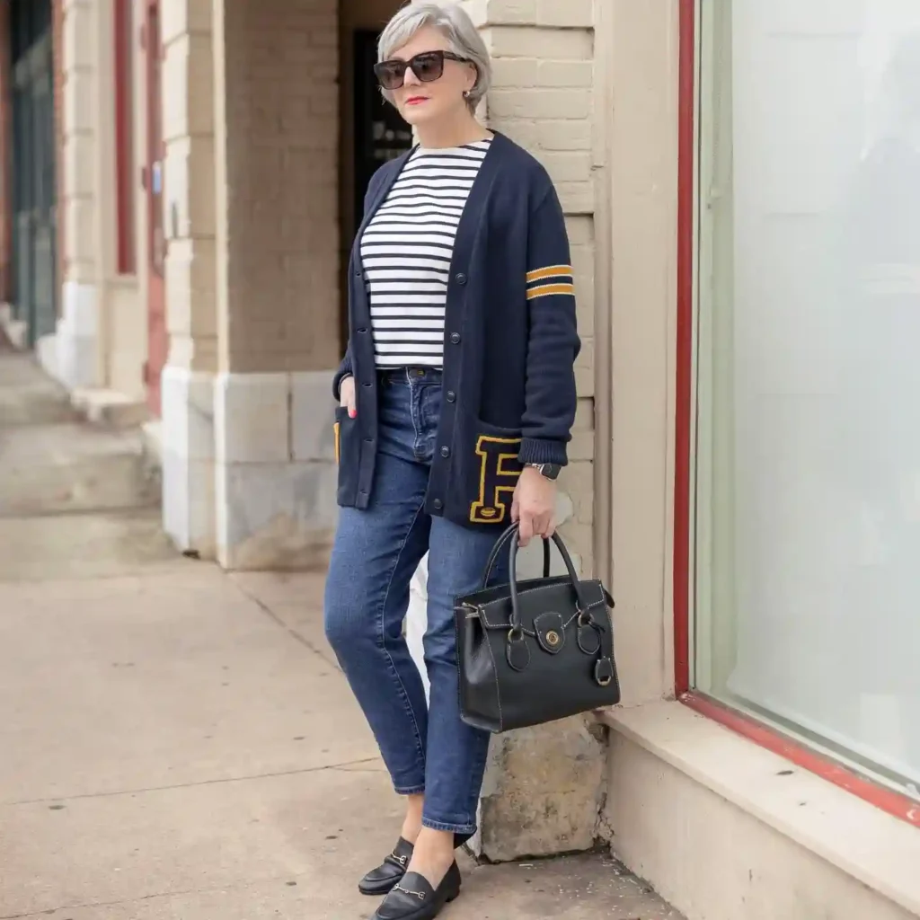 Pairing the casual cardigan with a classic Breton striped top and dark denim creates a multi-layered, “coastal” look that is both comfortable and curated. This is a brilliant ensemble for the traveler who prioritizes ease without sacrificing style.