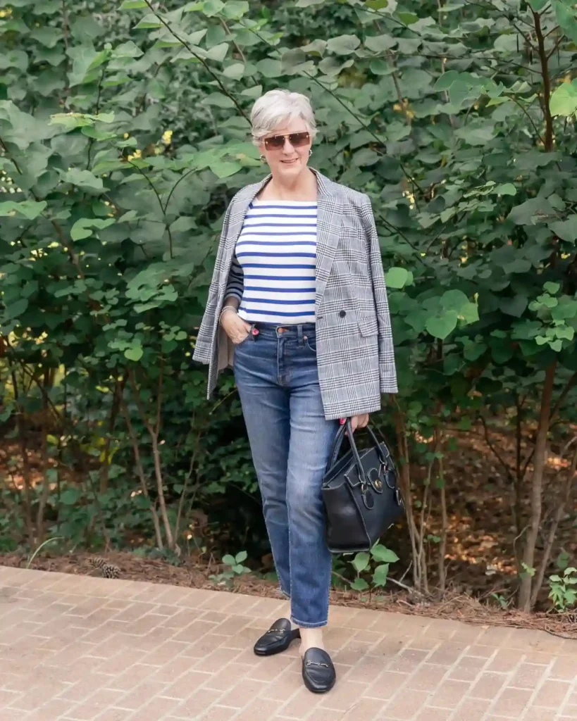 Layering a structured plaid blazer over the stripes adds an immediate professional polish, perfect for transitioning from a museum tour to a nice lunch. The blazer acts as the perfect lightweight coat for unpredictable spring or autumn weather.
