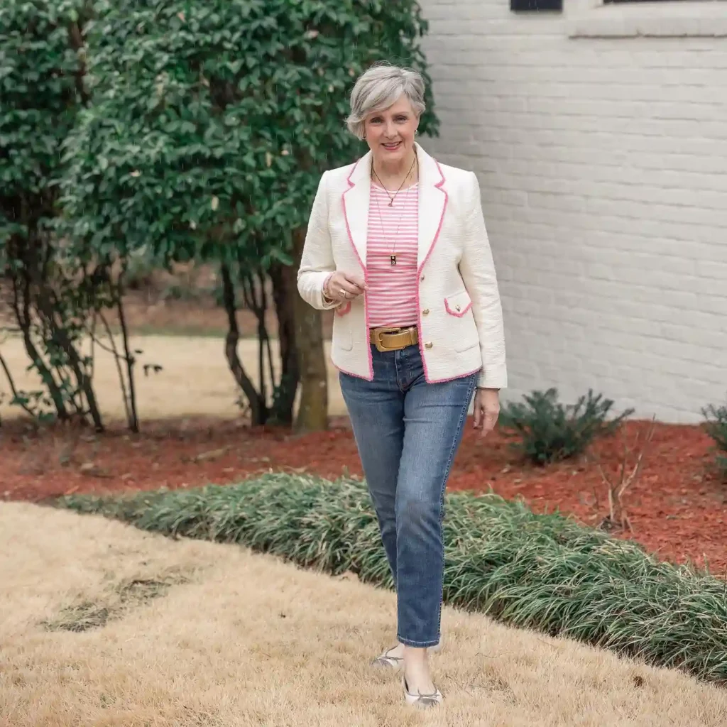 For a spring getaway, there is nothing more refreshing than a mix of baby pink, crisp white, and gold accents. A structured white blazer with pink trim feels youthful and “preppy” in the best possible way.