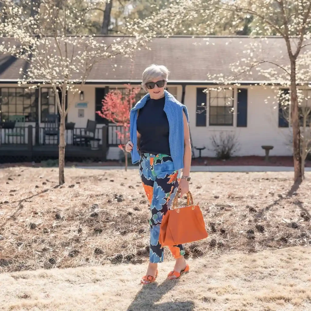 By keeping your top simple and dark, you allow the complex pattern of the pants to be the focal point without looking overwhelmed. Draping a bright blue sweater over your shoulders adds a layer of curated style that feels very “resort-chic.”