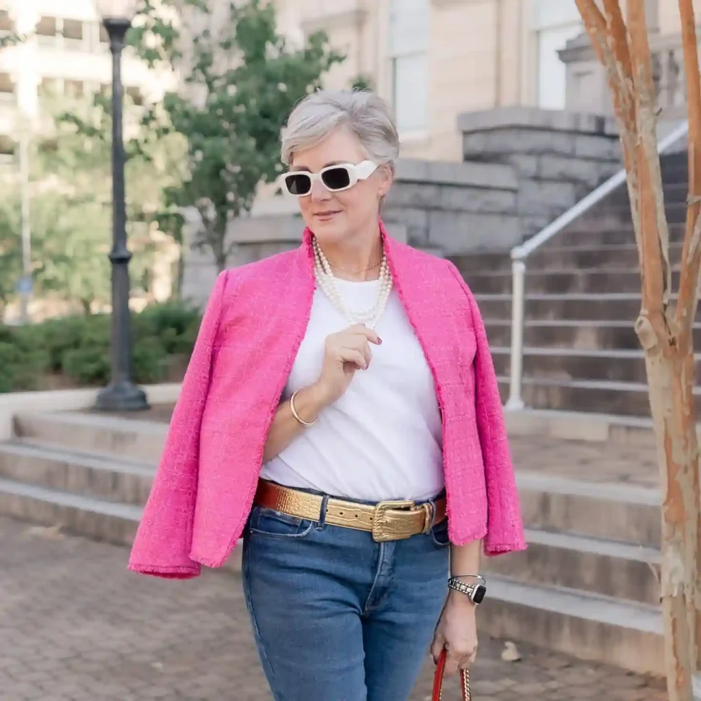 Travel is the perfect time to break away from neutrals and embrace a “power color” like fuchsia. A tweed-style jacket in a bold hue instantly elevates a basic white tee, making you stand out beautifully in holiday photos.