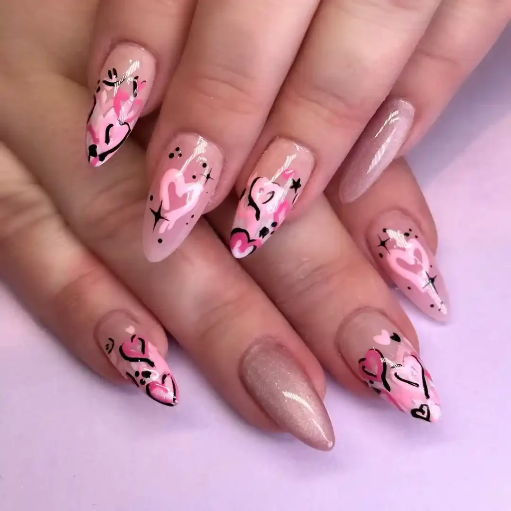 These almond nails mix soft pink tones with abstract heart shapes and black line accents. The contrast makes the design feel edgy but still romantic. I like this style for people who want Valentine nails that don’t look traditional. It’s artsy, modern, and great for anyone who loves statement nail art.