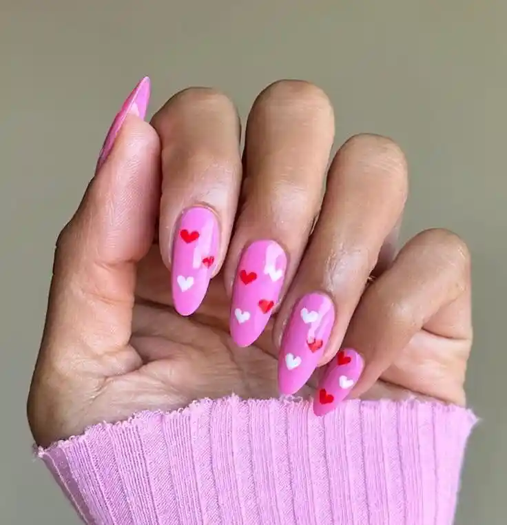 These pink nails feature scattered red and white hearts across a glossy base. The look is simple, sweet, and very on-theme for Valentine’s Day. This is one of those Valentine Day nail ideas that works for all ages. It’s easy to wear, easy to match, and doesn’t feel overdesigned.