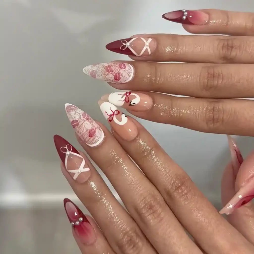 This bold stiletto set mixes deep red tones with lace textures, bows, and heart details. The contrast between matte, glossy, and patterned nails gives this look depth and drama. These Valentine nails are not shy they’re made to be noticed. Perfect for special date nights, parties, or anyone who loves statement nails with a romantic edge.