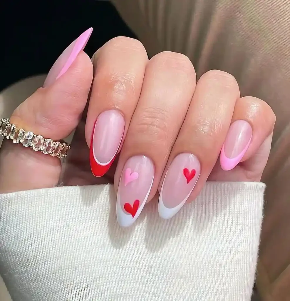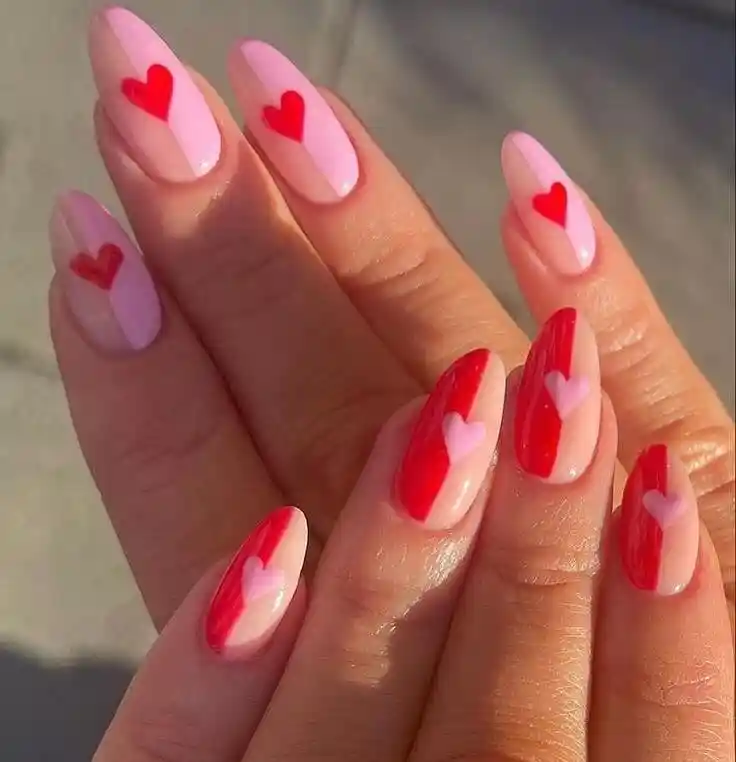 This almond-shaped set uses soft pink polish paired with bold red heart designs layered across the nail. The contrast makes the hearts stand out instantly. These Valentine nails are very eye-catching and work especially well in photos. If you want something romantic but still bold, this design does the job without adding extra elements.