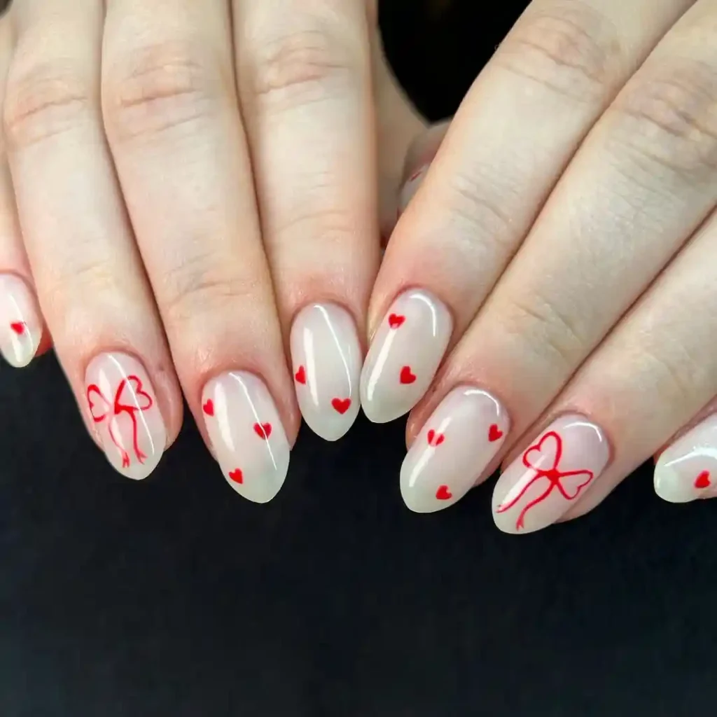This set mixes glossy red nails with soft nude accents, hand-painted bows, stripes, and a framed heart design. Each nail feels intentional but still cohesive. This is a strong Valentine Day nail idea if you like variety without chaos. It’s playful, creative, and works well for anyone who wants themed nails that still feel stylish, not childish.