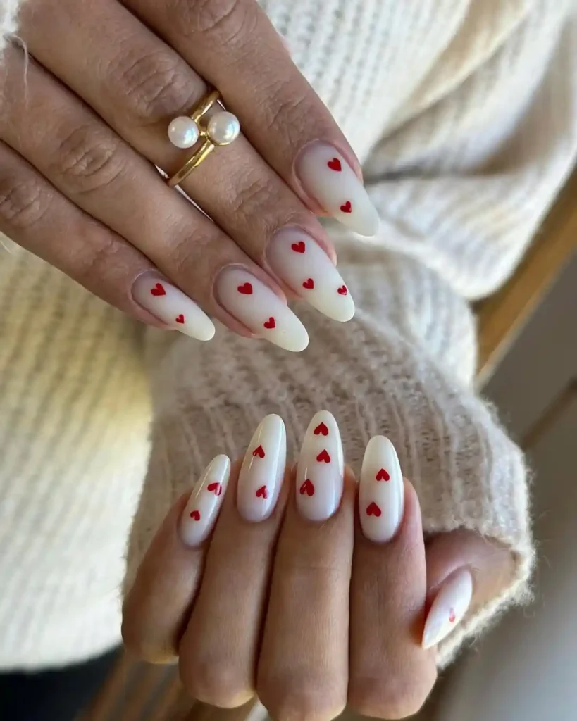 This set features a milky white base with tiny red hearts placed evenly across each nail. It’s simple, soft, and very wearable. If someone asks for safe Valentine Day nail ideas, this is always a win. It looks clean, elegant, and pairs well with cozy outfits or neutral looks.
