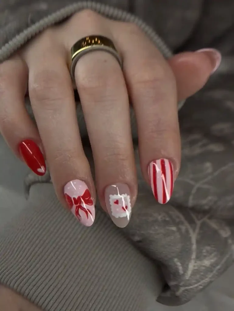 12.Mixed Red Valentine Nails with Bows and Stripes