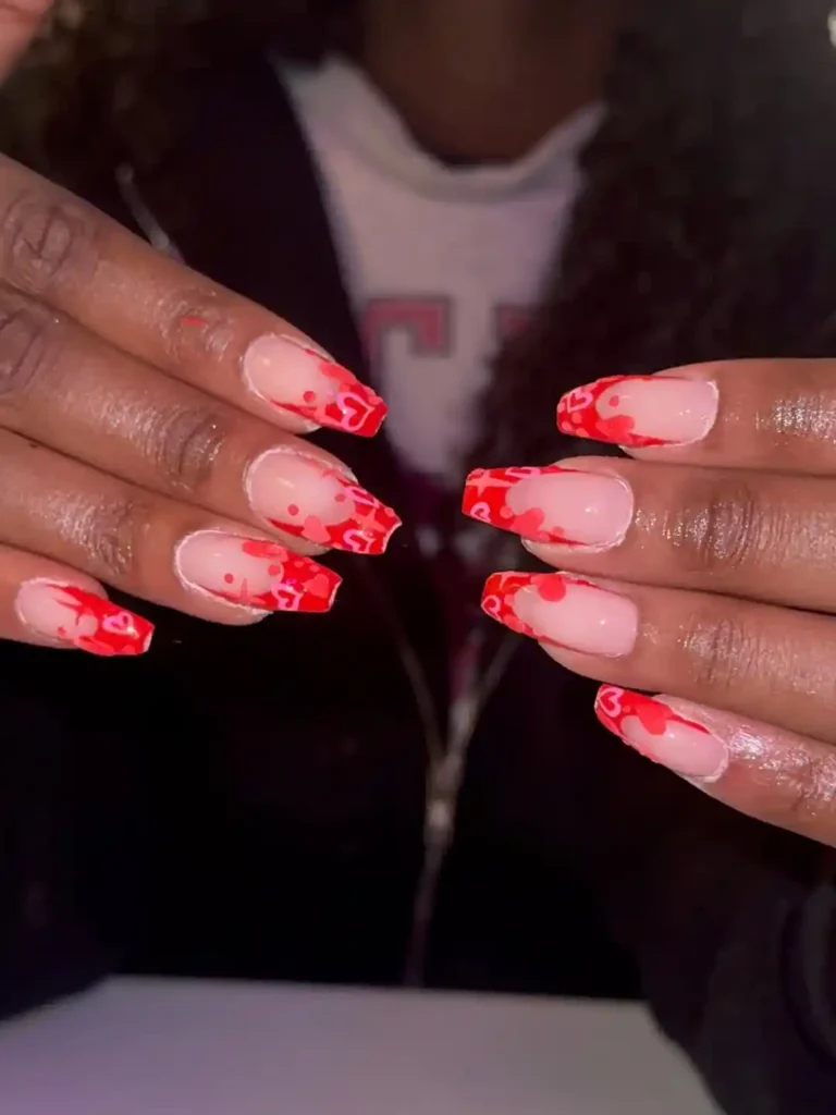 These nails keep a clean nude base and add bold red heart patterns concentrated around the tips. The design feels modern and flattering on almond shapes. I like this one because it’s romantic without being busy. These Valentine Day nails work well for date nights and still look good after February ends.