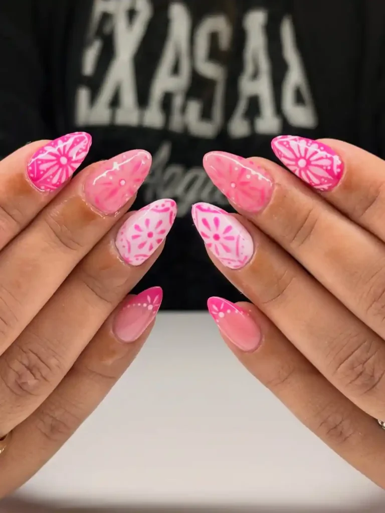 This set uses layered pink shades with white floral and mandala-style patterns across almond nails. The glossy finish keeps everything polished while the design adds texture. These Valentine nails feel more artistic than themed, which is a good thing if you want something unique. Ideal for anyone who wants pink Valentine nails without obvious hearts everywhere.