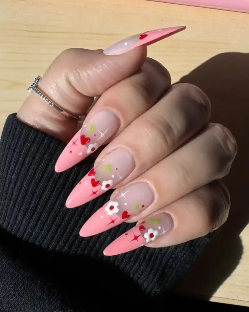 8.Pink Ombre Stiletto Nails with Hearts and Florals