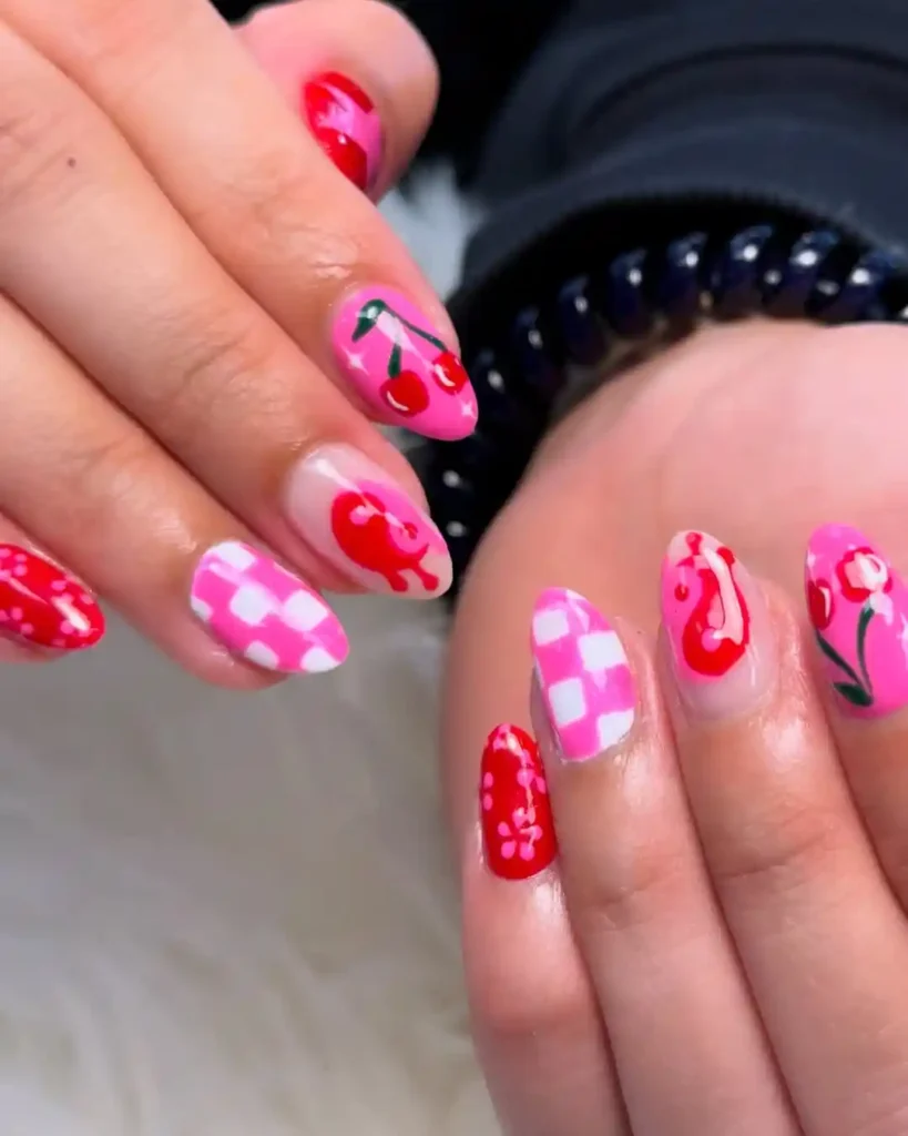 18.Pink Valentine Nails with Cherry and Gingham Art