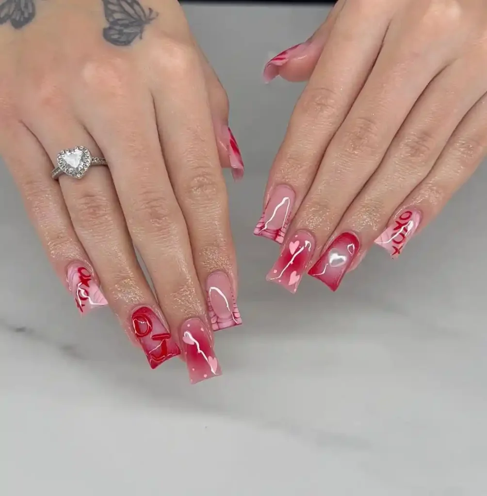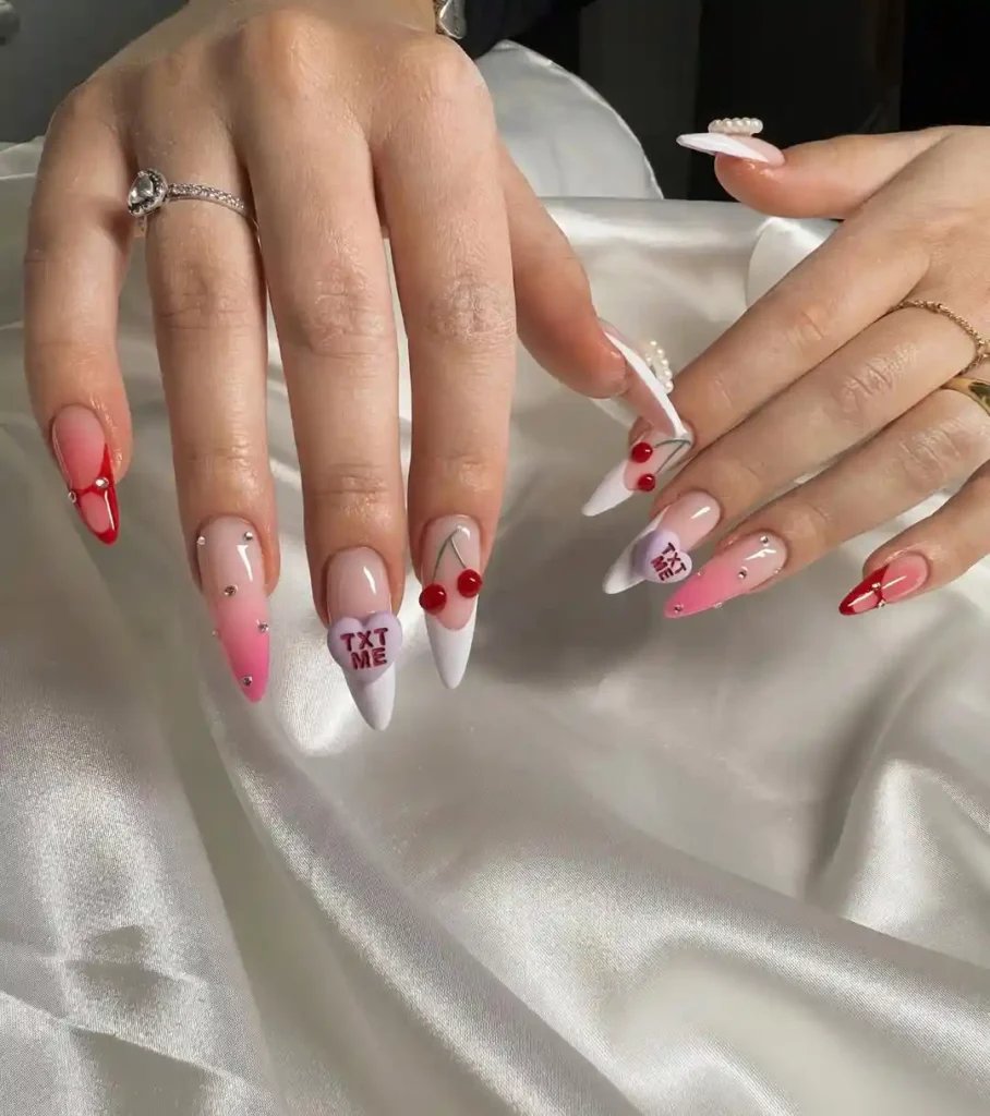 This long almond set combines pink ombre nails, pearls, cherry art, and playful text accents. It’s bold and expressive without feeling messy. These Valentine Day nails are perfect for content creators or anyone who wants nails that stand out in photos. Definitely more dramatic, but done well.