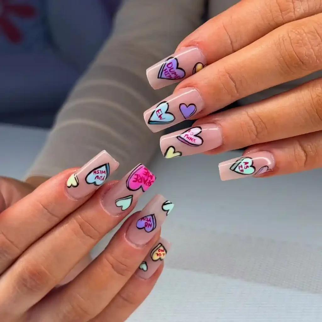 These square nails feature colorful heart designs with bold outlines and fun text details. The clear nude base keeps them balanced, while the mix of pastel and bright hearts adds personality. This is a great choice for anyone who wants Valentine nails that feel fun, young, and Instagram-ready. They’re ideal for girls’ nights, Galentine’s plans, or anyone who loves expressive nail art with a cute twist.