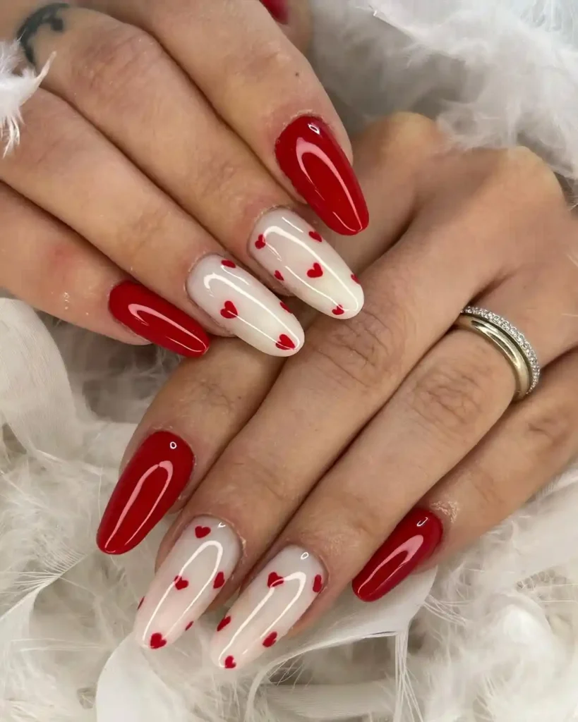 These nails alternate between glossy red polish and milky white nails decorated with tiny red hearts. The color pairing is classic and always works for Valentine Day nails. This style is great if you want something obvious but still neat. It’s bold without being messy, which makes it a safe but solid choice.