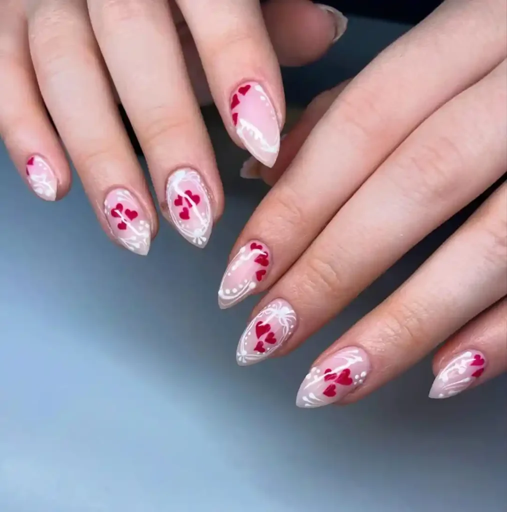 These almond nails feature a sheer nude base layered with delicate white lace-style details and tiny red hearts. The design feels romantic but still light and wearable. I like this one because it gives Valentine Day nails a soft, almost vintage look without going heavy on color. It’s perfect if you want something elegant for a date night but still subtle enough for everyday wear.