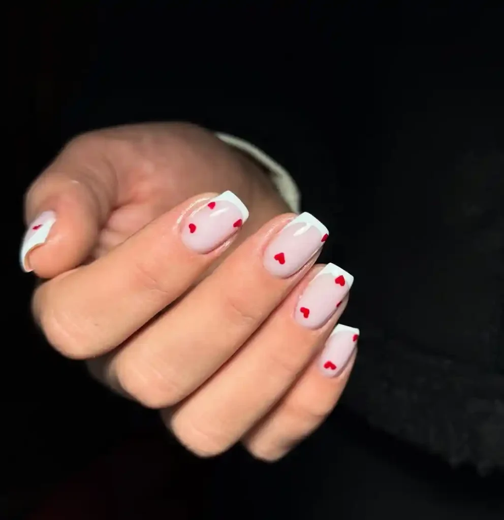 These short square nails combine classic white French tips with tiny red heart accents. The result is clean, cute, and very wearable. If you want Valentine nails that feel polished and simple, this set is a safe win. It works well for all ages and looks great for both everyday wear and low-key Valentine plans.