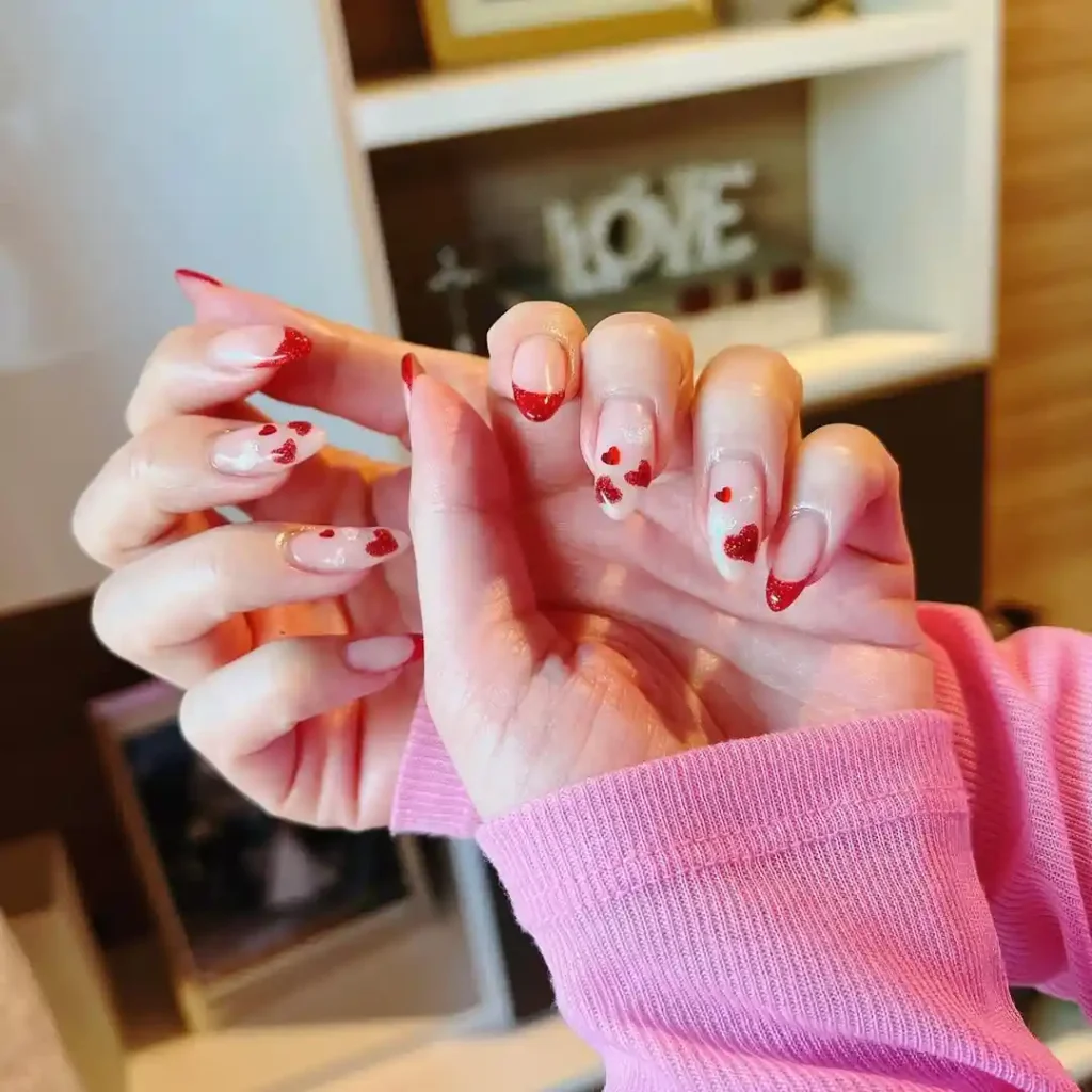 These short nails keep things simple with a nude base and glittery red heart accents concentrated near the tips. The sparkle adds charm without overpowering the design. I’d recommend this style for anyone who wants Valentine Day nails that are cute but practical. It’s a great option for short nails and low-maintenance routines.