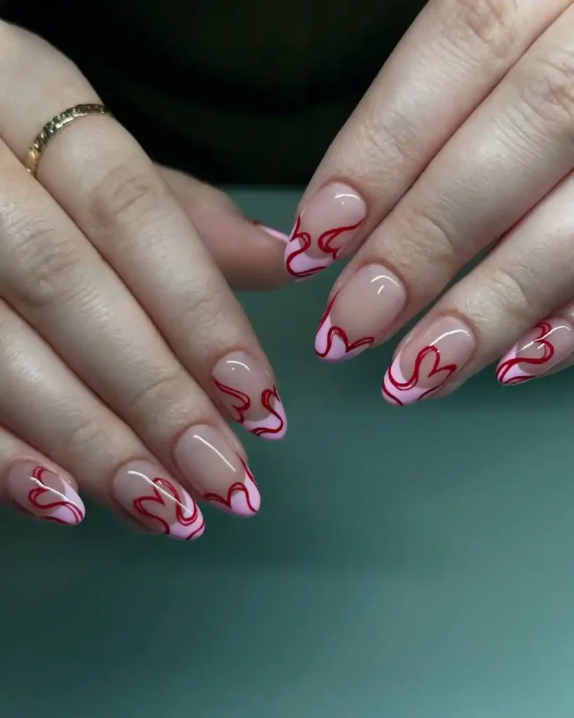 These nude almond nails use thin red line art to create abstract heart shapes that feel modern and flirty. The glossy base keeps everything clean, while the flowing red details add just enough Valentine energy without looking loud. This design is perfect if you want Valentine Day nails that still feel wearable after February 14. Great for casual dates, coffee runs, or low-key plans where subtle detail stands out.
