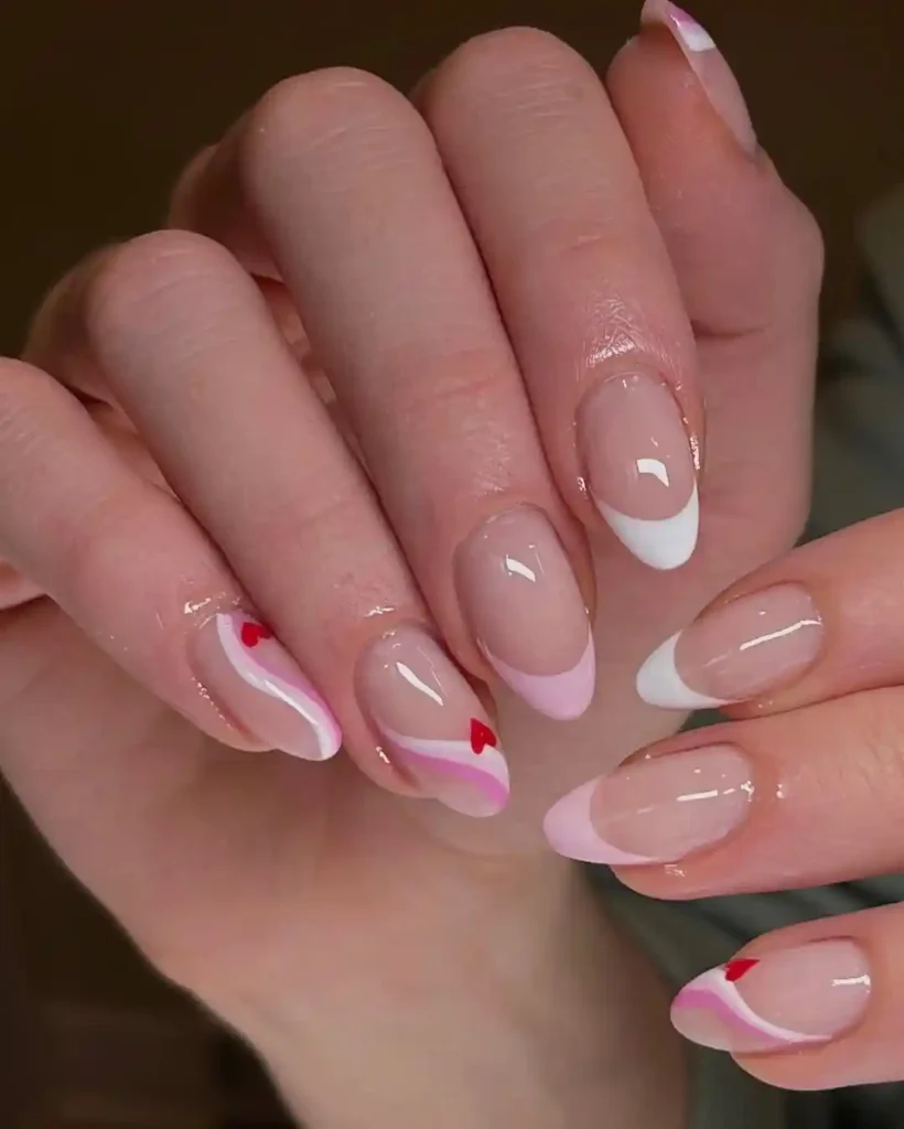 These short almond nails use a pale pink French tip and delicate red hearts for a sweet, balanced look. The design feels clean and gentle, making it great for anyone who prefers understated Valentine nails. This set works well for daily wear, school, or work while still feeling special for the season. It’s cute without trying too hard.