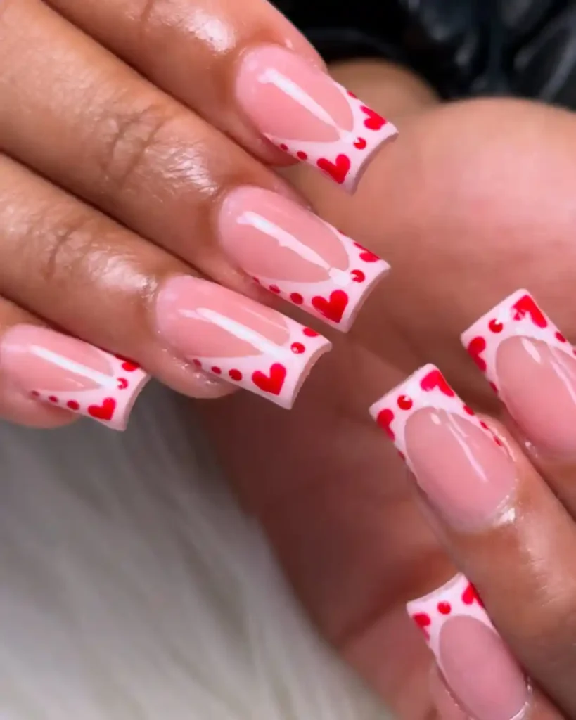These square nails feature a nude base with white French tips lined in small red hearts. The detail around the edges makes this design stand out without needing extra art. This is one of my favorite Valentine Day nail ideas because it’s creative but still clean. It works especially well on medium-length nails.