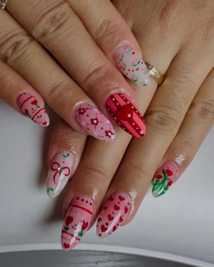 This detailed set mixes hearts, florals, stripes, and bow designs across a soft pink base. Each nail tells a different story, but the color palette keeps it cohesive. These Valentine nails are perfect if you love detailed nail art and want something custom-looking. Best for longer nails where the designs can really shine.
